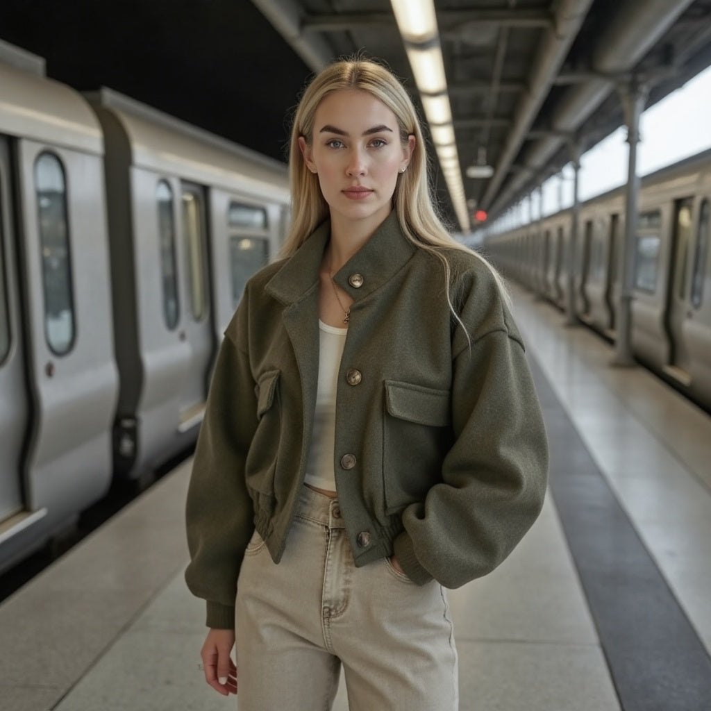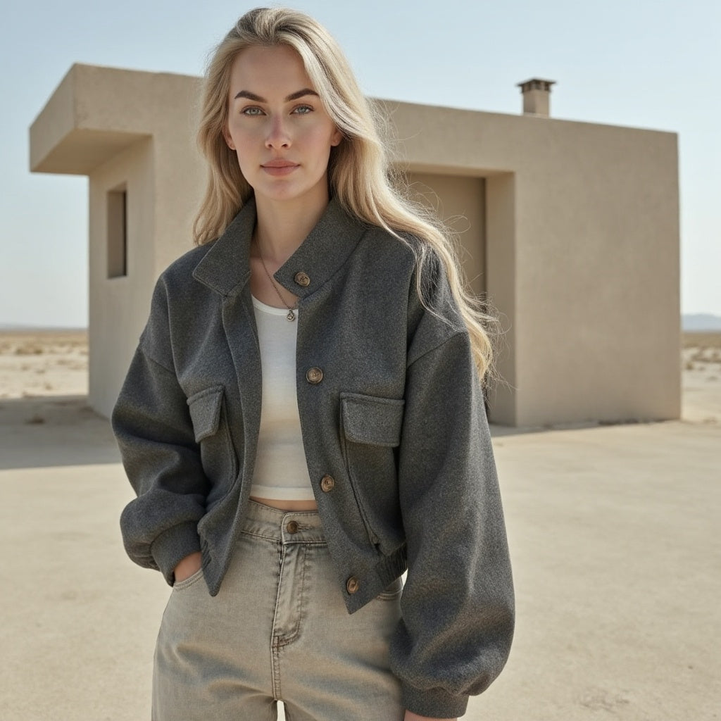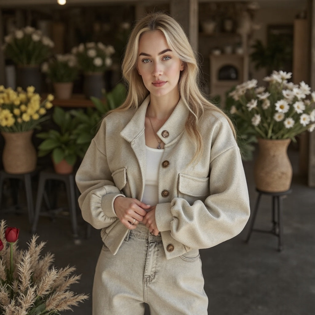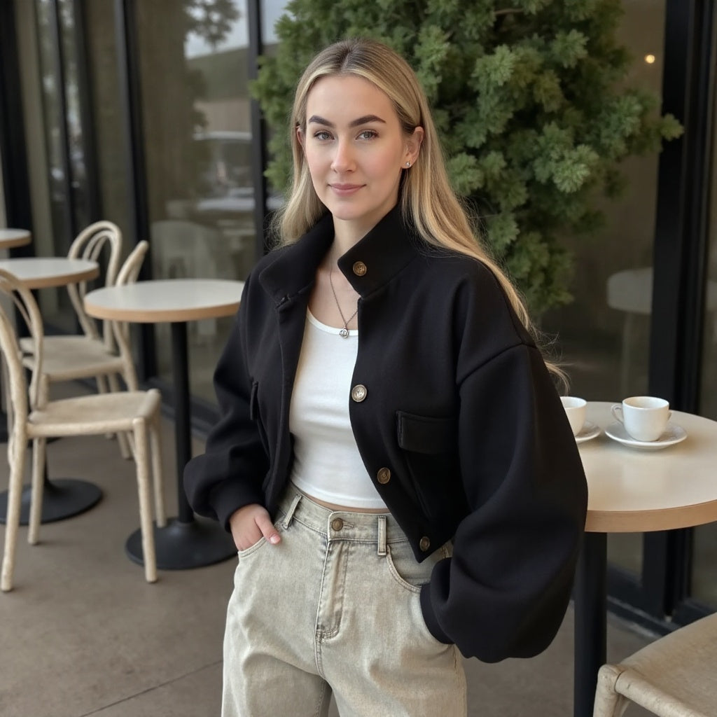 Bringen Sie Eleganz in Ihren Alltag mit der Leona, einer modernen Kurzjacke, die jeden Look aufwertet. Mit ihrem eleganten Knopfdesign und der perfekten Passform vereint sie zeitlose Klasse und zeitgenössischen Stil.